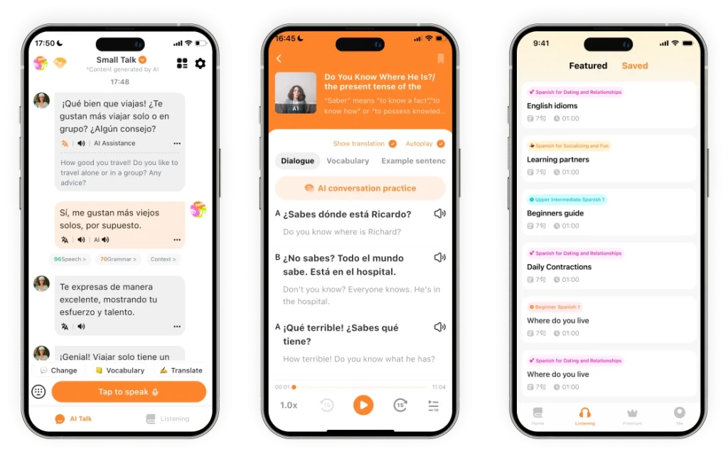 That’s us! The app includes hundreds of common practice scenarios, various tutors with different personalities, real-time text and speech assessments within your conversations, and more. Another notable feature that sets Spanish Ai apart is immersive audio lessons. These are great starting points for your conversations with the AI tutor.